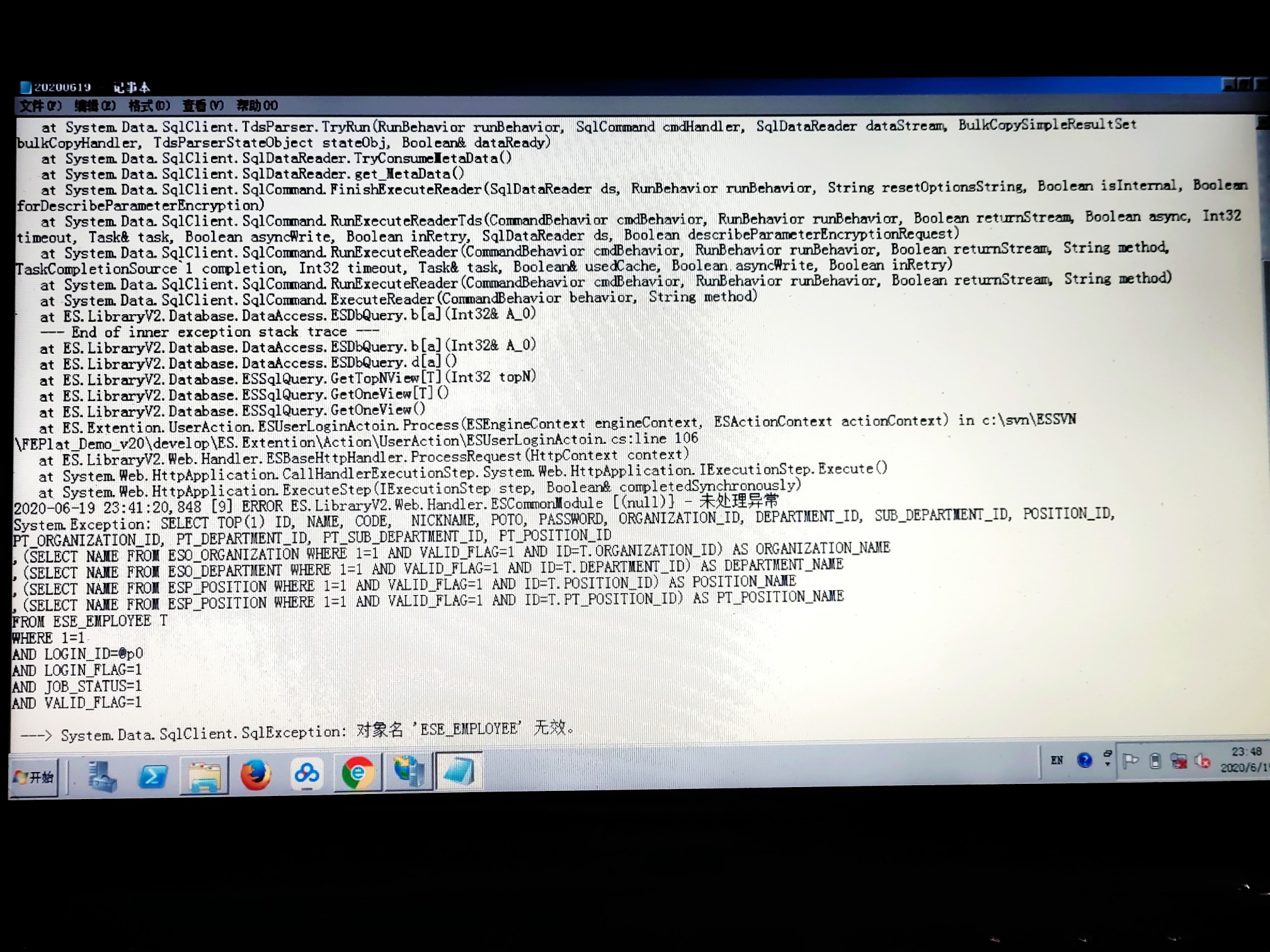日志里写的很清楚 对象名(表名)无效,也就是这个表“ESE_EMPLOYEE”不存在。是不是没有把权限导入业务表。或者用开发者账号登录即可。